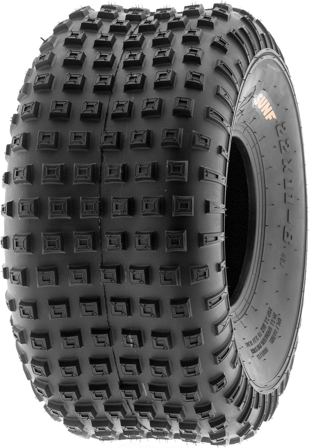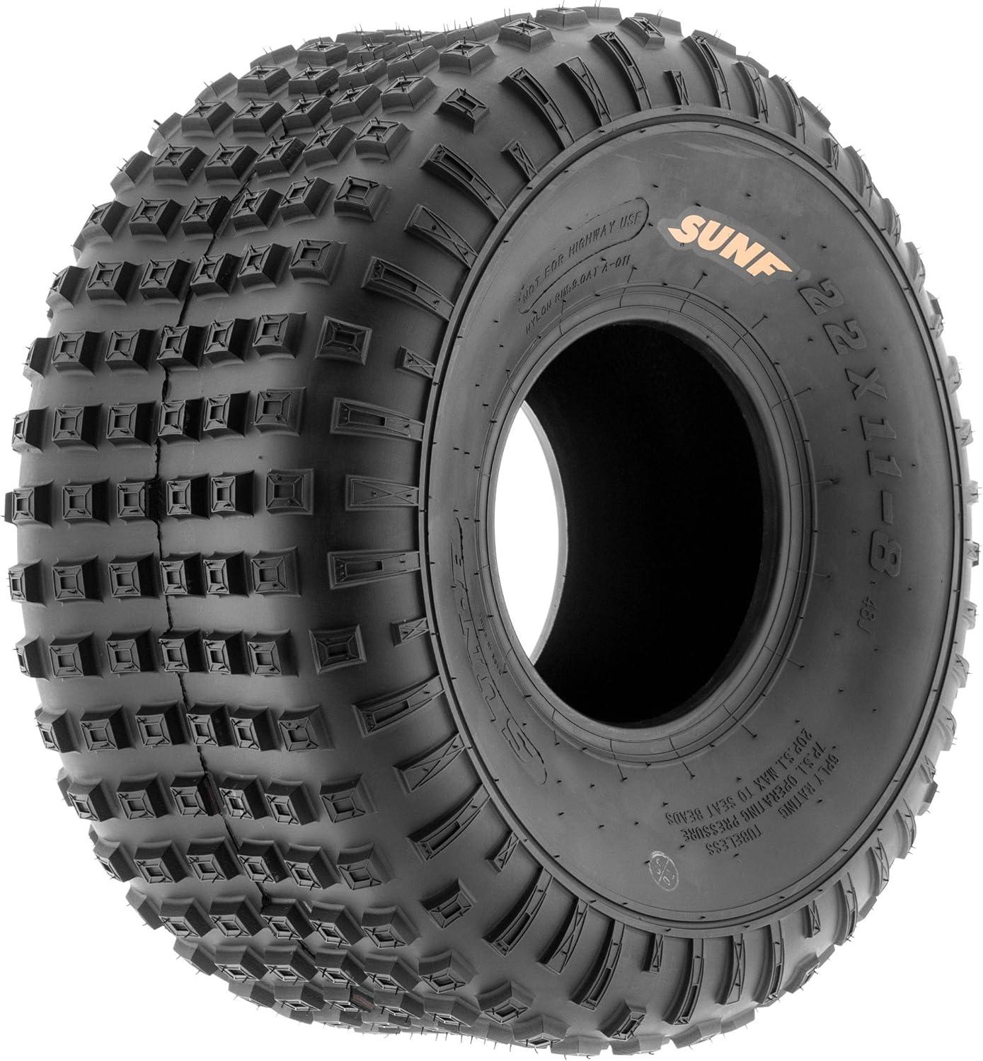 SunF Corporation has dedicated themselves to meeting their customer’s demands and needs. SunF develops and manufactures a wide variety of quality tires in the specialty market. Their line up includes ST trailer, lawn and garden, agriculture, golf cart, ATV Quad Motorcycle, UTV Side by Side, light truck & more!The SUNF A011 ATV tire is equipped with a distinctive non-directional “grid dimple” tread pattern, optimizing all-terrain performance with exceptional traction and stability.All-Terrain Capability: Engineered to excel across diverse terrains, including mud, sand, and rocky surfaces, the A011 tire delivers reliable and consistent performance for off-road enthusiasts seeking versatile traction.Robust 6 Ply Construction: Crafted with a sturdy 6-ply construction, the A011 tire offers durability, effectively resisting punctures, cuts, and impacts to tackle rugged off-road conditions with resilience.Shoulder Traction Enhancement: Featuring advanced shoulder traction technology, the A011 tire ensures superior grip during turns and challenging maneuvers on various terrains, enhancing off-road confidence.Extensive Size Range: Available in sizes ranging from 13 to 25 inches, the SUNF A011 tire accommodates a wide range of ATV models and rider preferences, ensuring a customized fit for various vehicle setups and demands.Size 1: 22×11-8