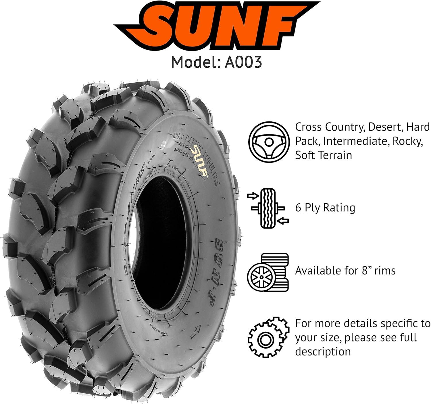 SunF Corporation has dedicated themselves to meeting their customer’s demands and needs. SunF develops and manufactures a wide variety of quality tires in the specialty market. Their line up includes ST trailer, lawn and garden, agriculture, golf cart, ATV Quad Motorcycle, UTV Side by Side, light truck & more!The SUNF A003 ATV tire boasts a purpose-built directional tread pattern that enhances all-terrain capabilities, offering superior traction and stability.All-Terrain Performance: Designed to excel across different terrains, including mud, sand, and rocky surfaces, the A003 tire is a reliable choice for off-road enthusiasts seeking versatile performance.6 Ply Durability: Built with a robust 6-ply construction, the A003 tire guarantees exceptional durability, effectively resisting punctures, cuts, and impacts for prolonged off-road adventures.Shoulder Traction Technology: Featuring advanced shoulder traction technology, the A003 tire ensures optimal grip during cornering and challenging maneuvers on a variety of terrains.Size Versatility: Available in sizes ranging from 18 to 21 inches, the SUNF A003 tire offers a range of options to accommodate various ATV models and rider preferences, ensuring a suitable fit for different setups.Size 1: 18×7-8