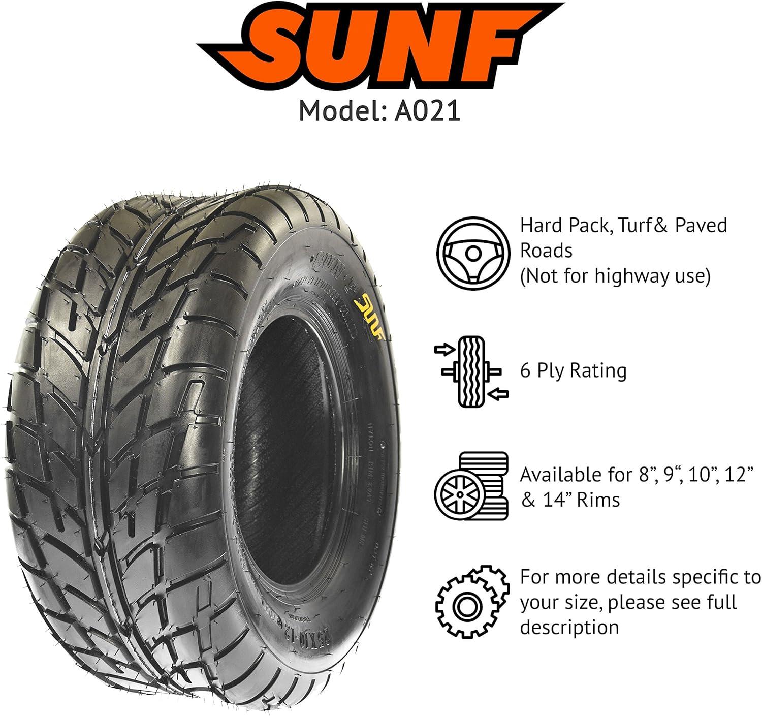 SunF Corporation has dedicated themselves to meeting their customer’s demands and needs. SunF develops and manufactures a wide variety of quality tires in the specialty market. Their line up includes ST trailer, lawn and garden, agriculture, golf cart, ATV Quad Motorcycle, UTV Side by Side, light truck & more!The SUNF A021 ATV tire boasts a specialized directional “street-like” tread pattern, optimized for exceptional performance on paved or hard-pack terrain, providing reliable traction and stability.All-Purpose Versatility: Engineered to perform seamlessly on paved trail roads and compacted trails, the A021 tire delivers consistent and dependable performance for ATV enthusiasts seeking versatility.Durable 6 Ply Construction: Built with a robust 6-ply construction, the A021 tire is engineered for durability, ensuring it can withstand the challenges of paved or hard-pack terrain with ease.Paved and Hard-Pack Terrain: Designed to excel on non-highway roads and hard surfaces, the A021 tire offers superior grip and control for riders seeking a smooth and stable ride in urban or outdoor environments.Wide Size Range: Available in sizes ranging from 13 to 26 inches, the SUNF A021 tire accommodates a broad spectrum of ATV models and rider preferences, ensuring a tailored fit for various vehicle setups and requirements.Size 1: 18×9.5-8