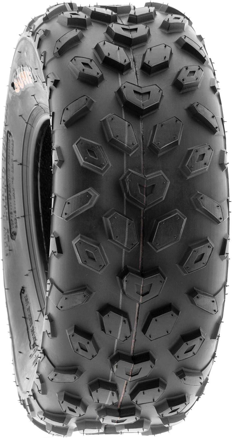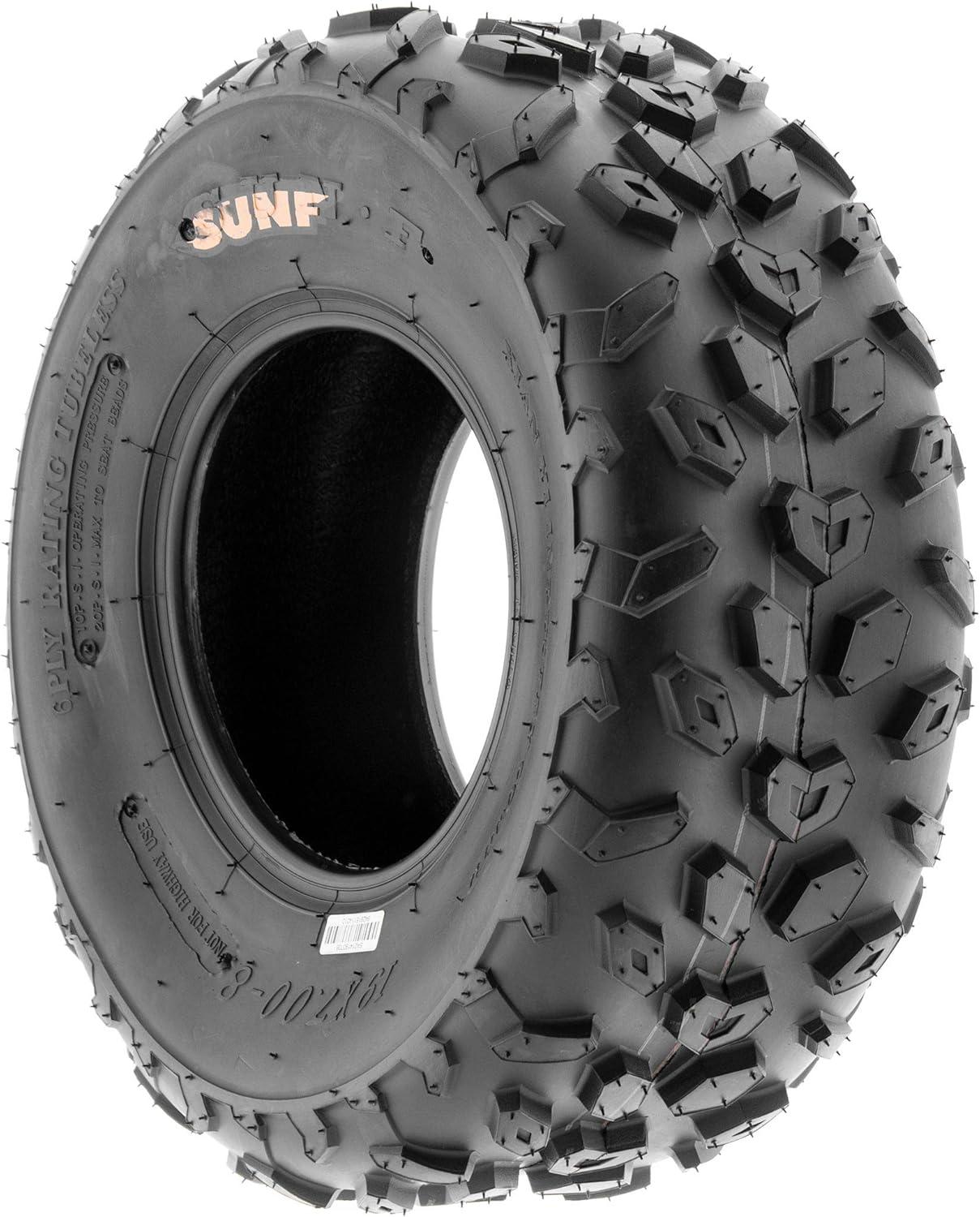 SunF Corporation has dedicated themselves to meeting their customer’s demands and needs. SunF develops and manufactures a wide variety of quality tires in the specialty market. Their line up includes ST trailer, lawn and garden, agriculture, golf cart, ATV Quad Motorcycle, UTV Side by Side, light truck & more!The SUNF A014 ATV tire showcases a purposeful directional tread pattern, optimized for outstanding all-terrain performance, delivering superior traction and stability.All-Terrain Excellence: Engineered to excel across diverse terrains, including mud, sand, and rocky surfaces, the A014 tire offers reliable and consistent performance for off-road enthusiasts seeking versatile traction.Durable 6 Ply Construction: Crafted with robust 6-ply construction, the A014 tire is built to last, effectively resisting punctures, cuts, and impacts, making it well-equipped to handle rigorous off-road conditions.Shoulder Traction Enhancement: Equipped with advanced shoulder traction technology, the A014 tire ensures exceptional grip during turns and challenging maneuvers on various terrains, providing heightened off-road control.Wide Size Range: Available in sizes ranging from 13 to 19 inches, the SUNF A014 tire accommodates a variety of ATV models and rider preferences, ensuring a tailored fit for different vehicle setups and needs.Size 1: 19×7-8