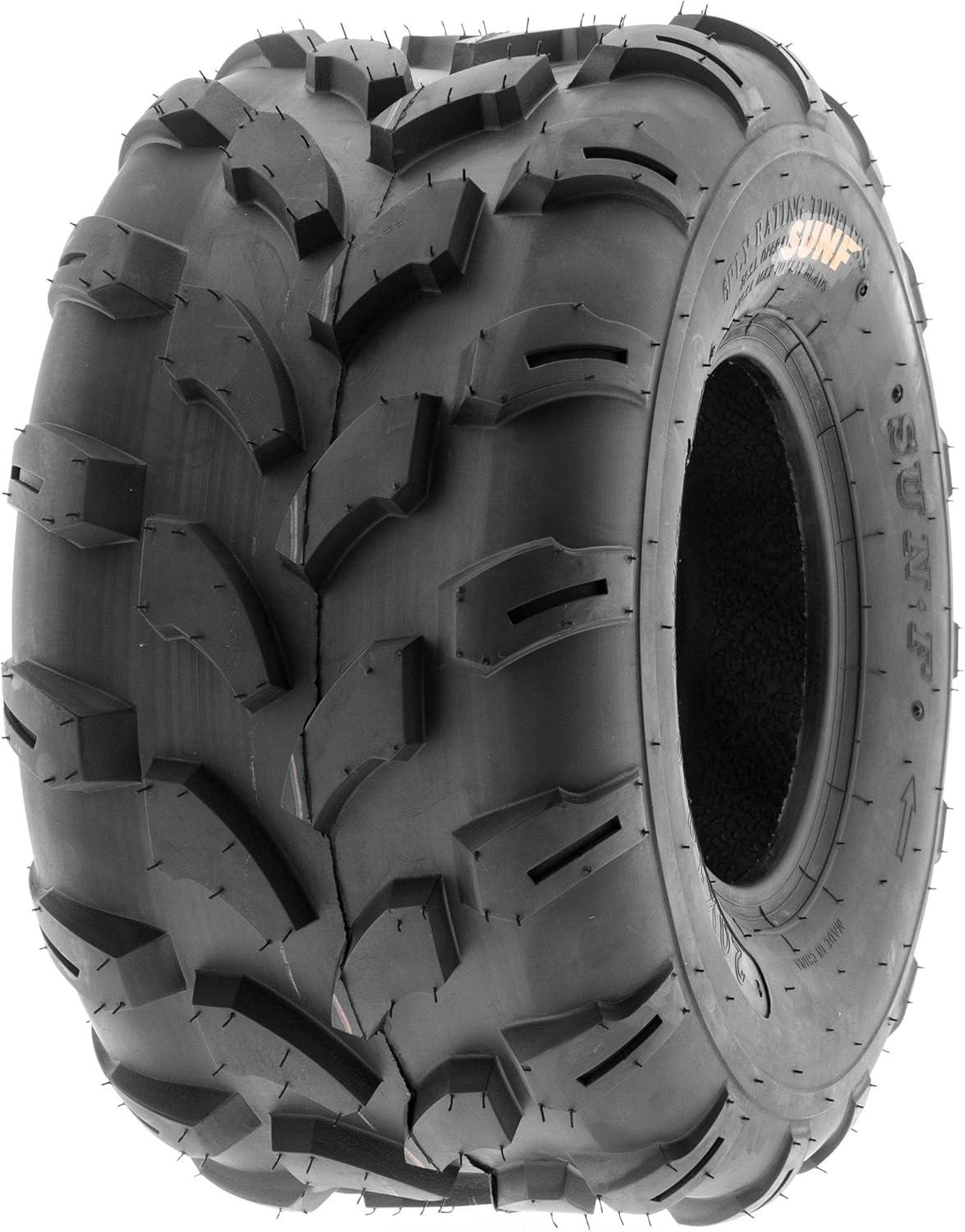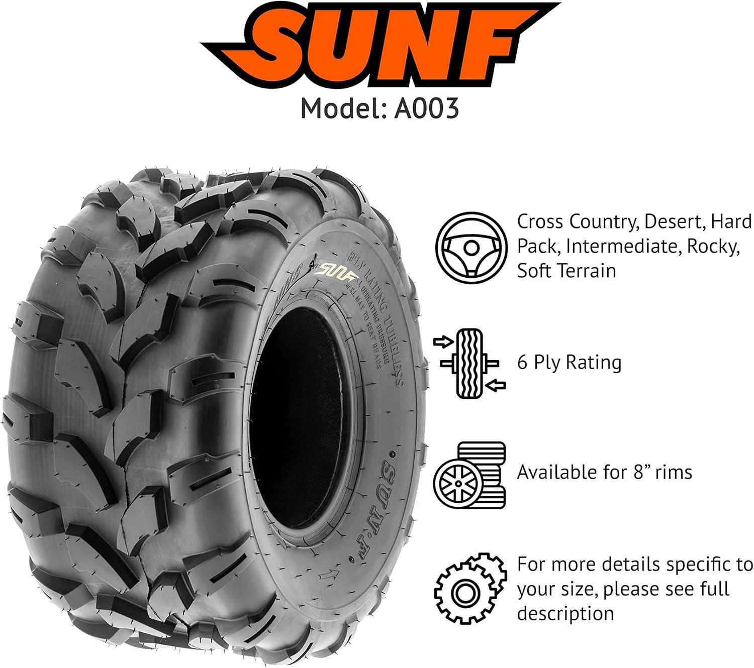 SunF Corporation has dedicated themselves to meeting their customer’s demands and needs. SunF develops and manufactures a wide variety of quality tires in the specialty market. Their line up includes ST trailer, lawn and garden, agriculture, golf cart, ATV Quad Motorcycle, UTV Side by Side, light truck & more!The SUNF A003 ATV tire boasts a purpose-built directional tread pattern that enhances all-terrain capabilities, offering superior traction and stability.All-Terrain Performance: Designed to excel across different terrains, including mud, sand, and rocky surfaces, the A003 tire is a reliable choice for off-road enthusiasts seeking versatile performance.6 Ply Durability: Built with a robust 6-ply construction, the A003 tire guarantees exceptional durability, effectively resisting punctures, cuts, and impacts for prolonged off-road adventures.Shoulder Traction Technology: Featuring advanced shoulder traction technology, the A003 tire ensures optimal grip during cornering and challenging maneuvers on a variety of terrains.Size Versatility: Available in sizes ranging from 18 to 21 inches, the SUNF A003 tire offers a range of options to accommodate various ATV models and rider preferences, ensuring a suitable fit for different setups.Size 1: 20×10-8