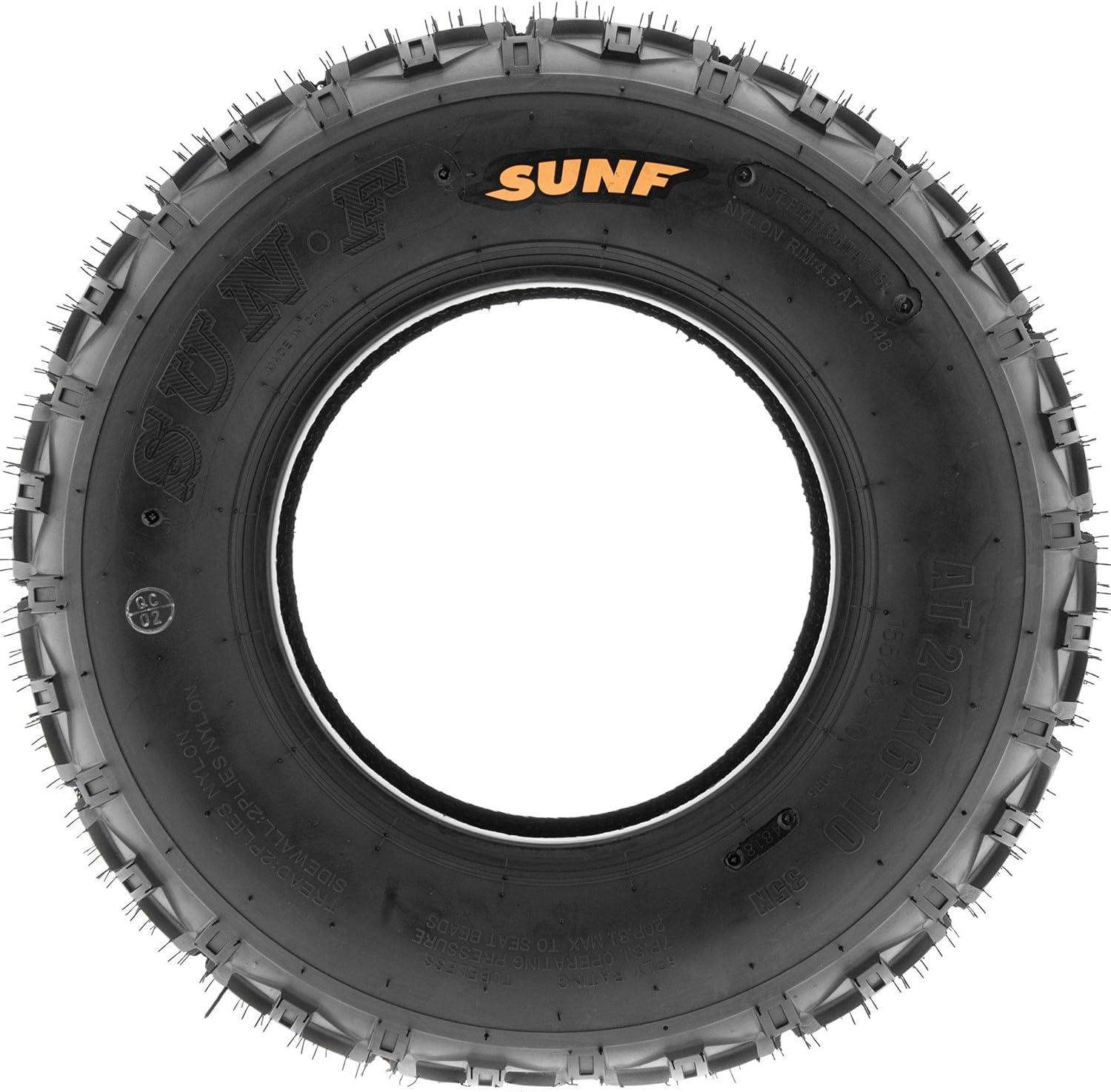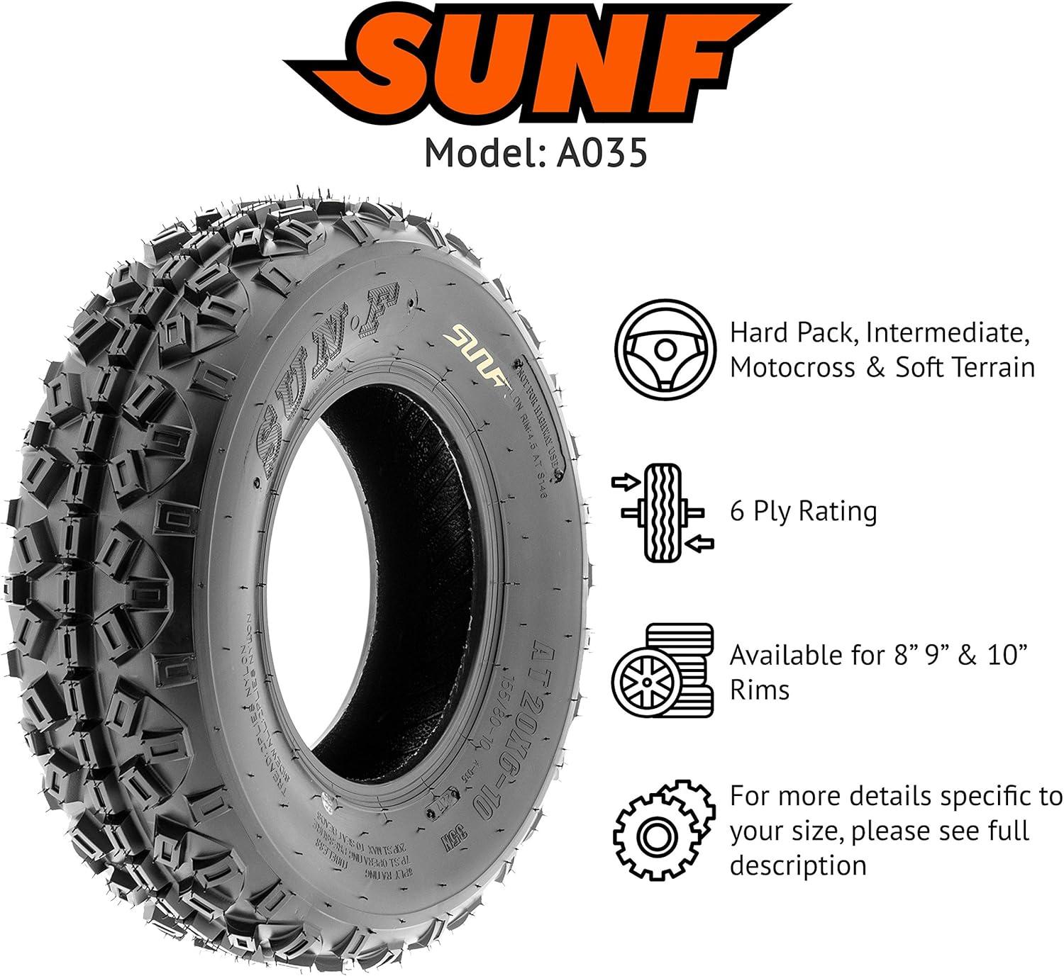 SunF Corporation has dedicated themselves to meeting their customer’s demands and needs. SunF develops and manufactures a wide variety of quality tires in the specialty market. Their line up includes ST trailer, lawn and garden, agriculture, golf cart, ATV Quad Motorcycle, UTV Side by Side, light truck & more!The SUNF A035 ATV tire features a specialized directional “Angled Square Knobby” tread pattern, meticulously designed for exceptional all-terrain and racing performance, providing reliable traction and stability.All-Terrain Racing Mastery: Engineered to excel across various terrains, from mud to sand and rough tracks, the A035 tire offers consistent and dependable performance for off-road racers seeking versatile traction.Durable 6 Ply Construction: Crafted with a robust 6-ply construction, the A035 tire is engineered for durability, effectively resisting punctures, cuts, and impacts to withstand the rigorous demands of racing and off-road conditions.Shoulder Traction Innovation: Equipped with advanced shoulder traction technology, the A035 tire ensures superior grip during high-speed turns and challenging maneuvers on diverse terrains, enhancing off-road control for racing enthusiasts.Sizes Ranging from 18 to 21 Inches: With sizes ranging from 18 to 21 inches, the SUNF A035 tire caters to a variety of ATV models and rider preferences, ensuring optimized traction and stability for various racing setups and performance requirements.Size 1: 21×6-10