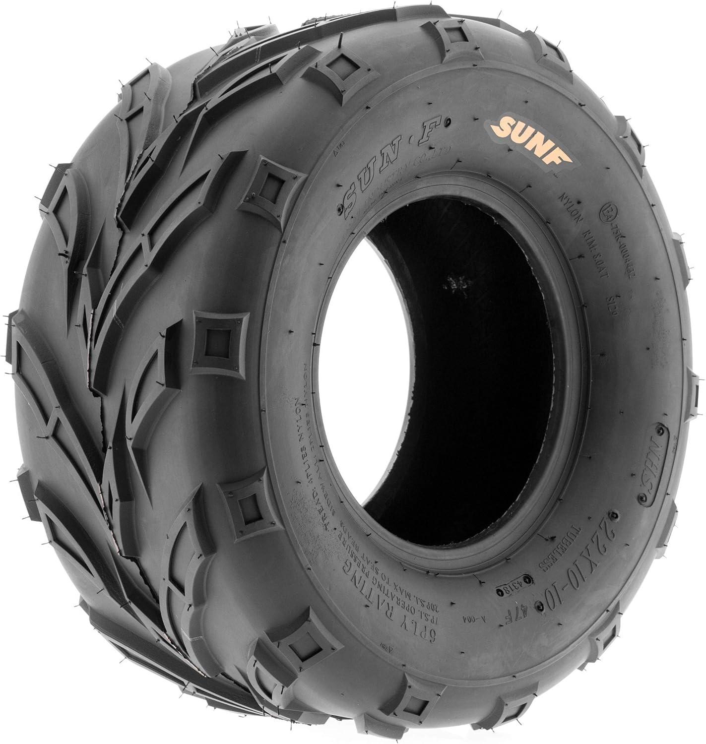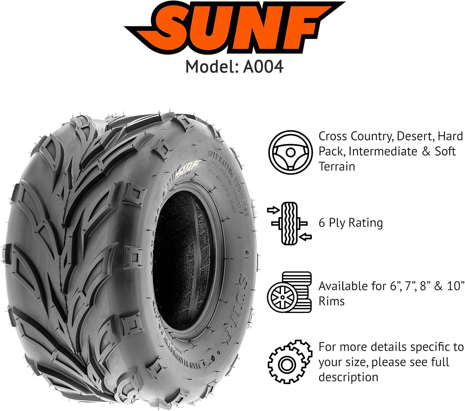 SunF Corporation has dedicated themselves to meeting their customer’s demands and needs. SunF develops and manufactures a wide variety of quality tires in the specialty market. Their line up includes ST trailer, lawn and garden, agriculture, golf cart, ATV Quad Motorcycle, UTV Side by Side, light truck & more!The SUNF A004 ATV tire showcases a specialized directional “V” tread design, enhancing all-terrain performance by providing exceptional traction and control.All-Terrain Mastery: Tailored for all types of terrains, including mud, sand, and rocky landscapes, the A004 tire stands out as a reliable choice for off-road enthusiasts seeking versatile and dependable performance.Durable 4 or 6 Ply Build: Available in both 4 and 6 ply options, the A004 tire is constructed to withstand tough conditions, offering increased durability and resistance against punctures, cuts, and impacts.Shoulder Traction Innovation: Equipped with cutting-edge shoulder traction technology, the A004 tire ensures superior grip during turns and challenging off-road maneuvers across diverse terrains.Extensive Size Range: With sizes ranging from 13 to 23 inches, the SUNF A004 tire accommodates a wide array of ATV models and rider preferences, ensuring a perfect fit for various vehicle setups and requirements.Size 1: 21×7-10