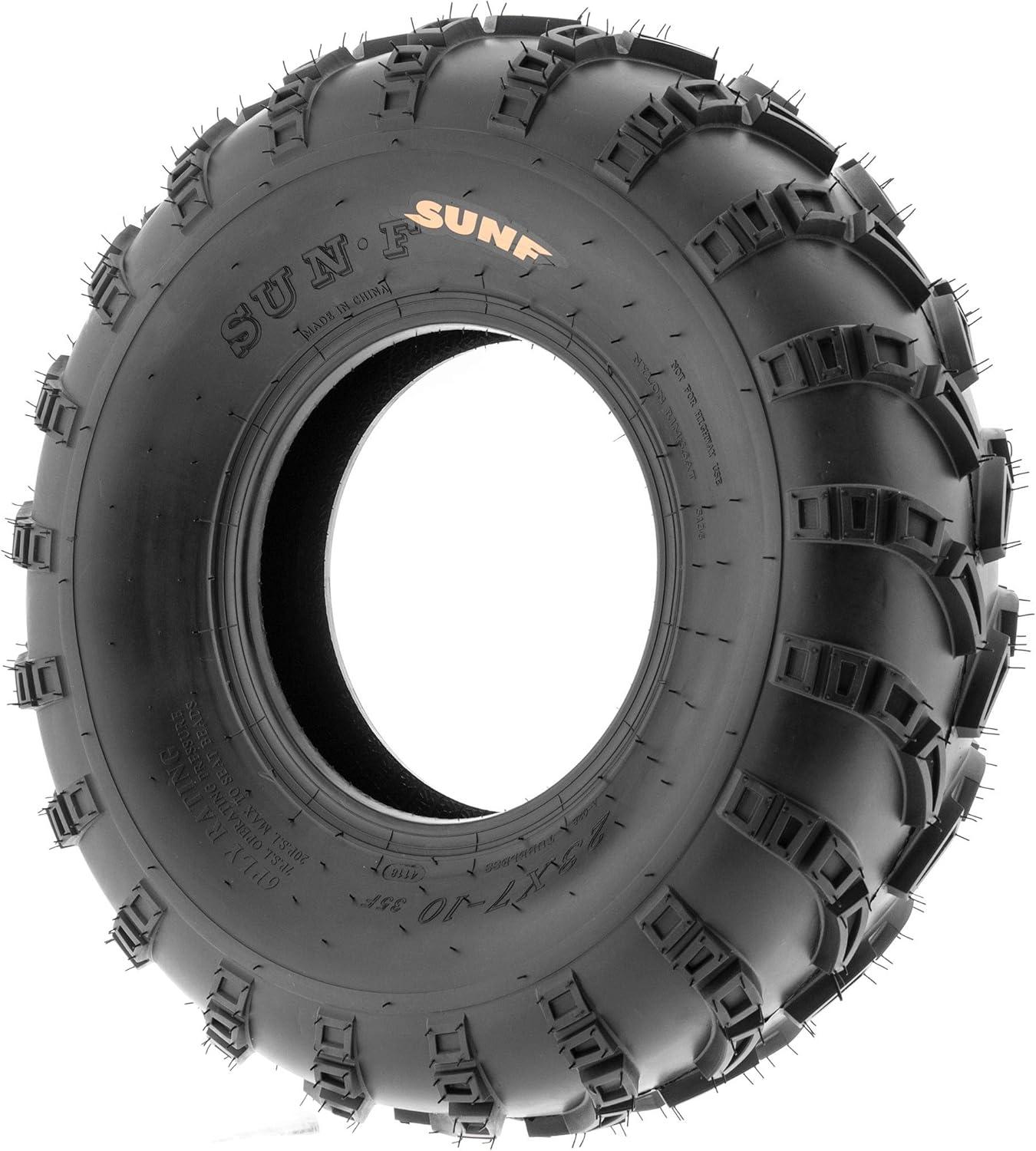 SunF Corporation has dedicated themselves to meeting their customer’s demands and needs. SunF develops and manufactures a wide variety of quality tires in the specialty market. Their line up includes ST trailer, lawn and garden, agriculture, golf cart, ATV Quad Motorcycle, UTV Side by Side, light truck & more!The SUNF A028 ATV tire features a specialized directional “V” tread pattern, optimized for outstanding all-terrain performance, delivering reliable traction and stability.All-Terrain Excellence: Engineered to excel across diverse terrains, including mud, sand, and rocky surfaces, the A028 tire offers consistent and dependable performance for off-road enthusiasts seeking versatile traction.Durable 6 Ply Construction: Crafted with a robust 6-ply construction, the A028 tire is designed for durability, effectively resisting punctures, cuts, and impacts to tackle rugged off-road conditions with confidence.Shoulder Traction Enhancement: Equipped with advanced shoulder traction technology, the A028 tire ensures superior grip during turns and challenging maneuvers on various terrains, enhancing off-road control.Available in 22 to 23 Inches: With sizes ranging from 22 to 23 inches, the SUNF A028 tire provides options that suit a variety of ATV models, ensuring optimized traction and stability for various terrain types.Size 1: 22×10-10