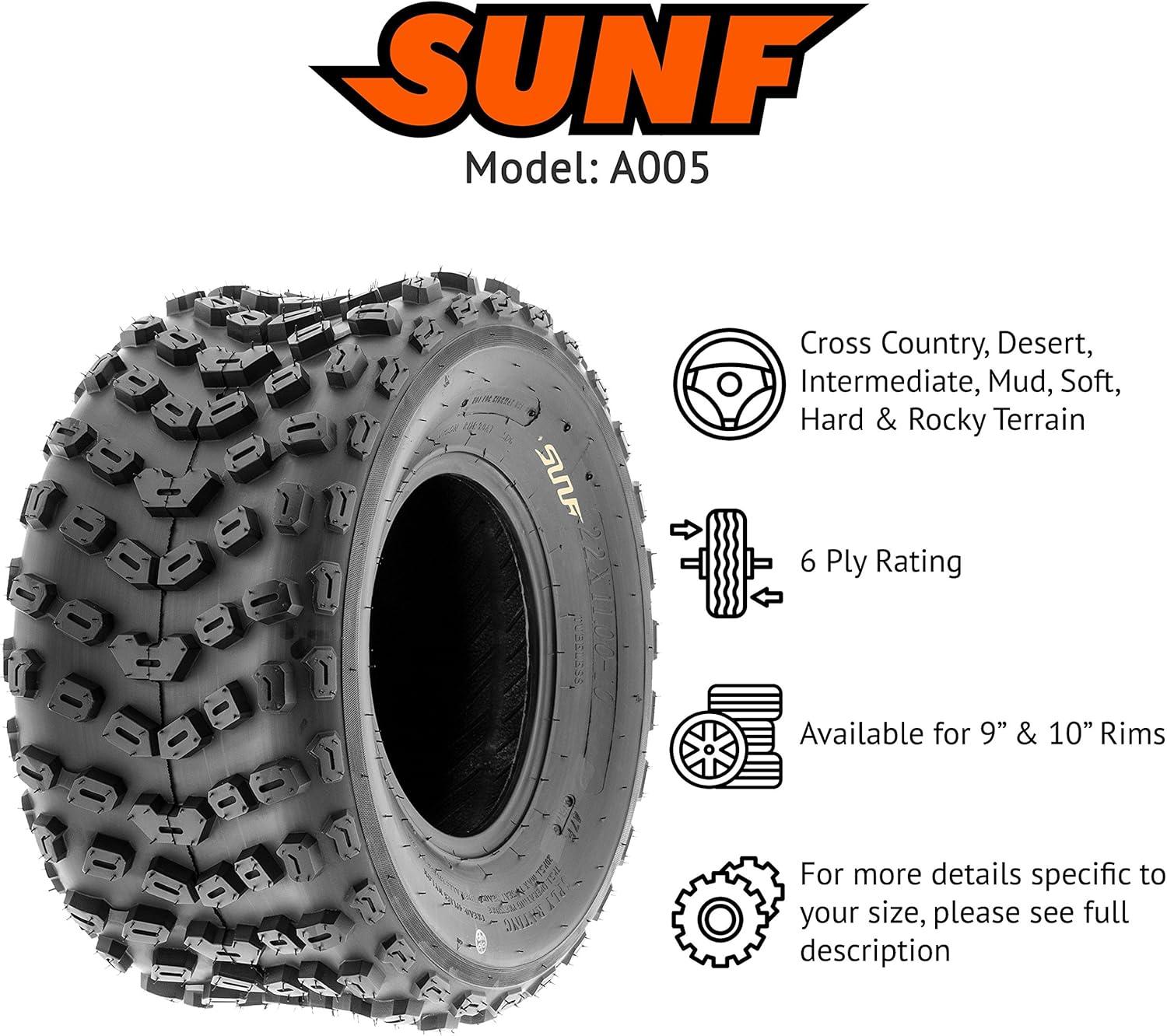 SunF Corporation has dedicated themselves to meeting their customer’s demands and needs. SunF develops and manufactures a wide variety of quality tires in the specialty market. Their line up includes ST trailer, lawn and garden, agriculture, golf cart, ATV Quad Motorcycle, UTV Side by Side, light truck & more!The SUNF A005 ATV tire boasts an advanced directional “V” tread pattern, optimizing all-terrain performance by delivering outstanding traction and stability.All-Terrain Versatility: Designed to excel across a variety of terrains, including mud, sand, and rocky surfaces, the A005 tire provides reliable and consistent performance for off-road enthusiasts.Robust 6 Ply Construction: Built with a sturdy 6-ply construction, the A005 tire is engineered to withstand tough conditions, offering heightened durability and resilience against punctures, cuts, and impacts.Shoulder Traction Enhancement: Featuring innovative shoulder traction technology, the A005 tire ensures superior grip during turns and challenging maneuvers, making it an ideal choice for diverse terrains.Available Size Options: Offered in 18 and 22 inches, the SUNF A005 tire provides a range of sizes to accommodate different ATV models and rider preferences, ensuring a tailored fit for various vehicle setups and needs.Size 1: 22×11-10