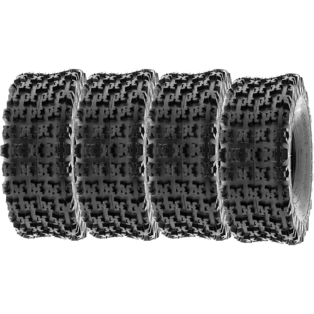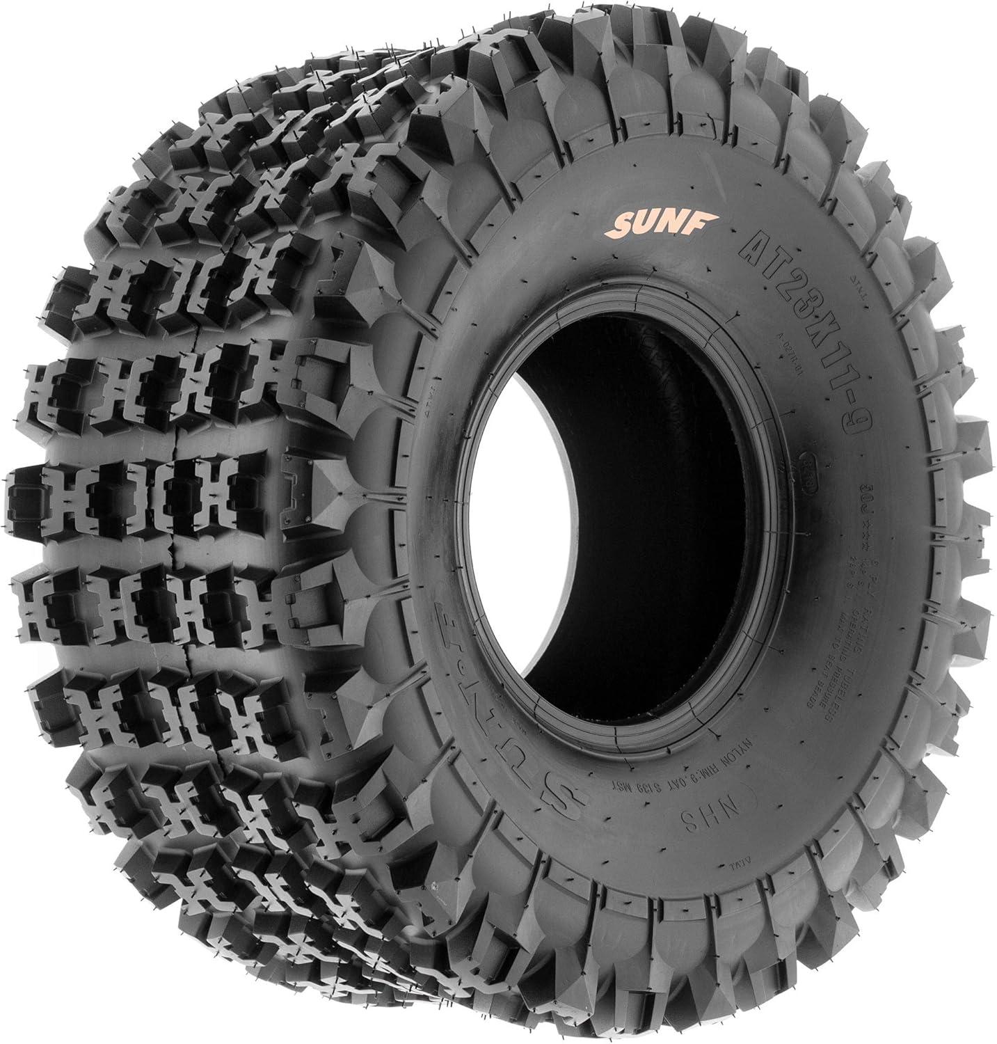 SunF Corporation has dedicated themselves to meeting their customer’s demands and needs. SunF develops and manufactures a wide variety of quality tires in the specialty market. Their line up includes ST trailer, lawn and garden, agriculture, golf cart, ATV Quad Motorcycle, UTV Side by Side, light truck & more!The SUNF A027 ATV tire showcases a specialized directional “X” tread pattern, optimized for exceptional all-terrain and racing performance, delivering superior traction and stability.All-Terrain Racing Capability: Engineered to excel across various terrains, including mud, sand, and rough tracks, the A027 tire offers consistent and dependable performance for off-road racers seeking versatile traction.Durable 6 Ply Construction: Crafted with a robust 6-ply construction, the A027 tire is designed for durability, effectively resisting punctures, cuts, and impacts to withstand the rigorous demands of racing and off-road conditions.Shoulder Traction Technology: Equipped with advanced shoulder traction technology, the A027 tire ensures exceptional grip during high-speed turns and challenging maneuvers on diverse terrains, enhancing off-road control for racing enthusiasts.Wide Size Range: Available in sizes ranging from 18 to 23 inches, the SUNF A027 tire accommodates a variety of ATV models and rider preferences, ensuring a customized fit for various racing setups and performance requirements.Size 1: 23×11-9