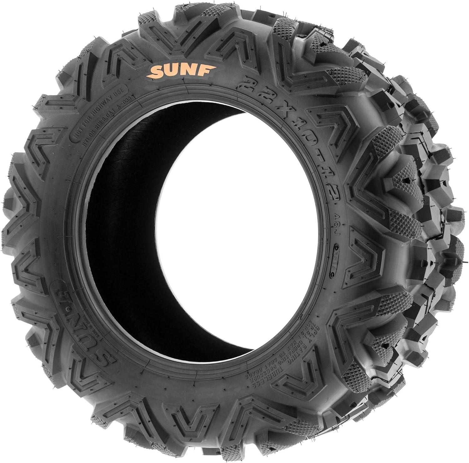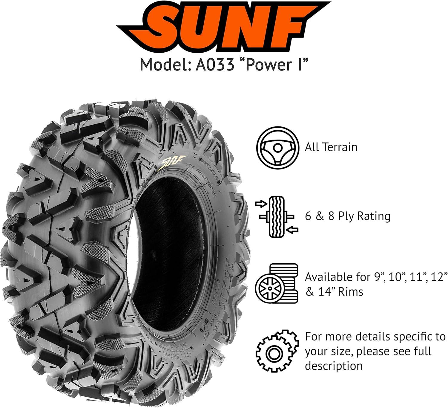 SunF Corporation has dedicated themselves to meeting their customer’s demands and needs. SunF develops and manufactures a wide variety of quality tires in the specialty market. Their line up includes ST trailer, lawn and garden, agriculture, golf cart, ATV Quad Motorcycle, UTV Side by Side, light truck & more!The SUNF A033 ATV, UTV & SxS tire features the innovative “Power I” non-directional tread pattern, meticulously engineered for exceptional all-terrain performance, delivering reliable traction and stability.All-Terrain Mastery: Engineered to excel across diverse terrains such as mud, sand, rocky landscapes, and more, the A033 tire offers consistent and dependable performance across a wide range of off-road environments at a more affordable price (compared to Bighorn).Durable 6 or 8 Ply Construction: Available in both 6 and 8 ply options depending on size, the A033 tire is built for durability, effectively resisting punctures, cuts, and impacts, making it well-suited to withstand the rigors of off-road adventures.Shoulder Traction Enhancement: Equipped with advanced shoulder traction technology, the A033 tire ensures superior grip during turns and challenging maneuvers on a variety of terrains, enhancing off-road control for ATV, UTV, and SxS enthusiasts.Sizes Ranging from 22 to 32 Inches: With a size range spanning from 22 to 32 inches, the SUNF A033 tire caters to a broad spectrum of ATV, UTV, and SxS models and rider preferences, ensuring optimized traction and stability for various vehicle setups.Size 1: 25×10-11
