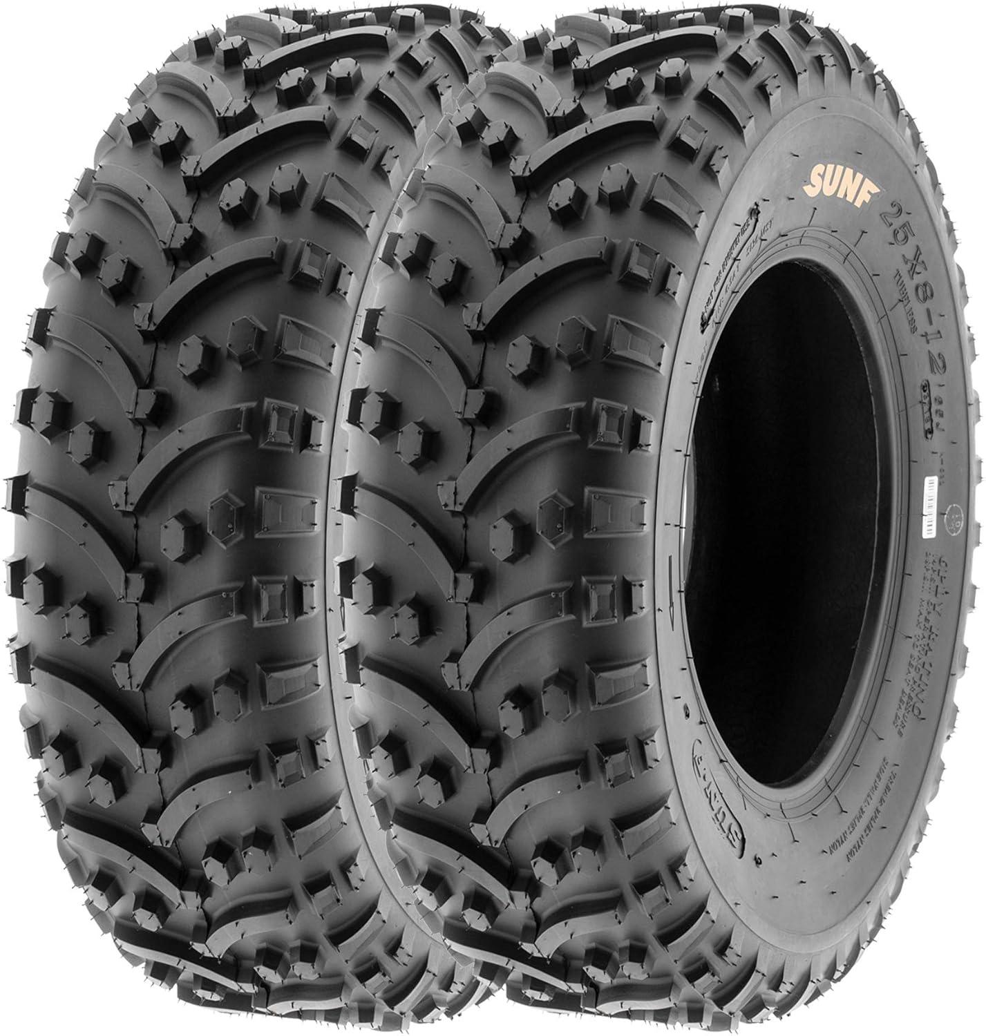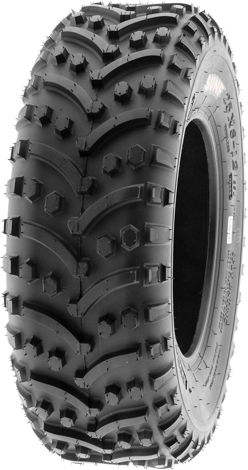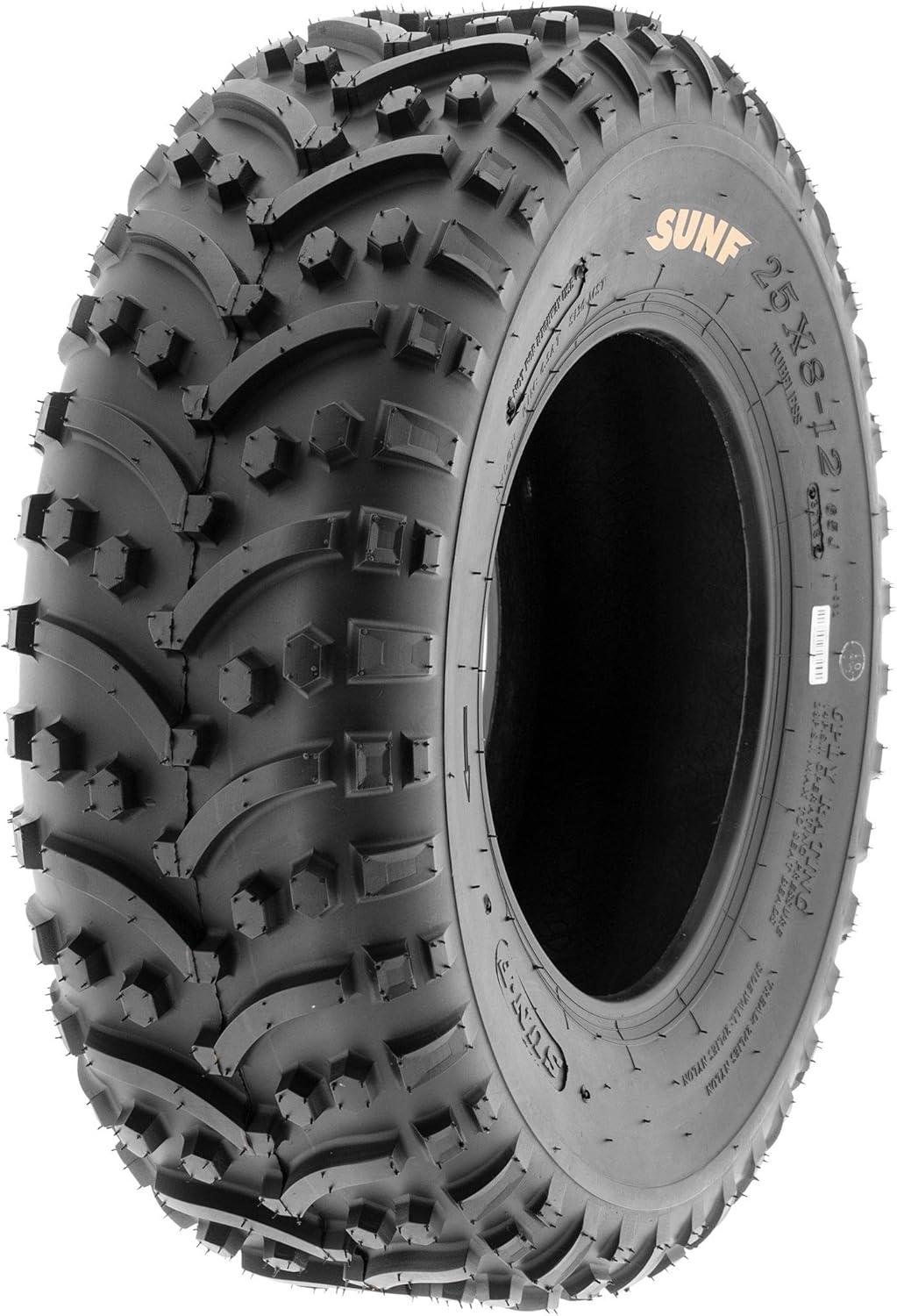 SunF Corporation has dedicated themselves to meeting their customer’s demands and needs. SunF develops and manufactures a wide variety of quality tires in the specialty market. Their line up includes ST trailer, lawn and garden, agriculture, golf cart, ATV Quad Motorcycle, UTV Side by Side, light truck & more!The SUNF A032 ATV tire features a specialized directional tread pattern, optimized for exceptional all-terrain performance, delivering reliable traction and stability.All-Terrain Excellence: Engineered to excel across various terrains, including mud, sand, and rocky surfaces, the A032 tire offers consistent and dependable performance for off-road enthusiasts seeking versatile traction.Durable 6 Ply Construction: Crafted with a robust 6-ply construction, the A032 tire is designed for durability, effectively resisting punctures, cuts, and impacts to tackle rugged off-road conditions with confidence.Shoulder Traction Technology: Equipped with advanced shoulder traction technology, the A032 tire ensures superior grip during turns and challenging maneuvers on diverse terrains, enhancing off-road control.Wide Size Range: Available in sizes ranging from 22 to 25 inches, the SUNF A032 tire accommodates a variety of ATV models and rider preferences, ensuring a customized fit for various vehicle setups and requirements.Size 1: 25×8-12 | Size 2: 25×10-12
