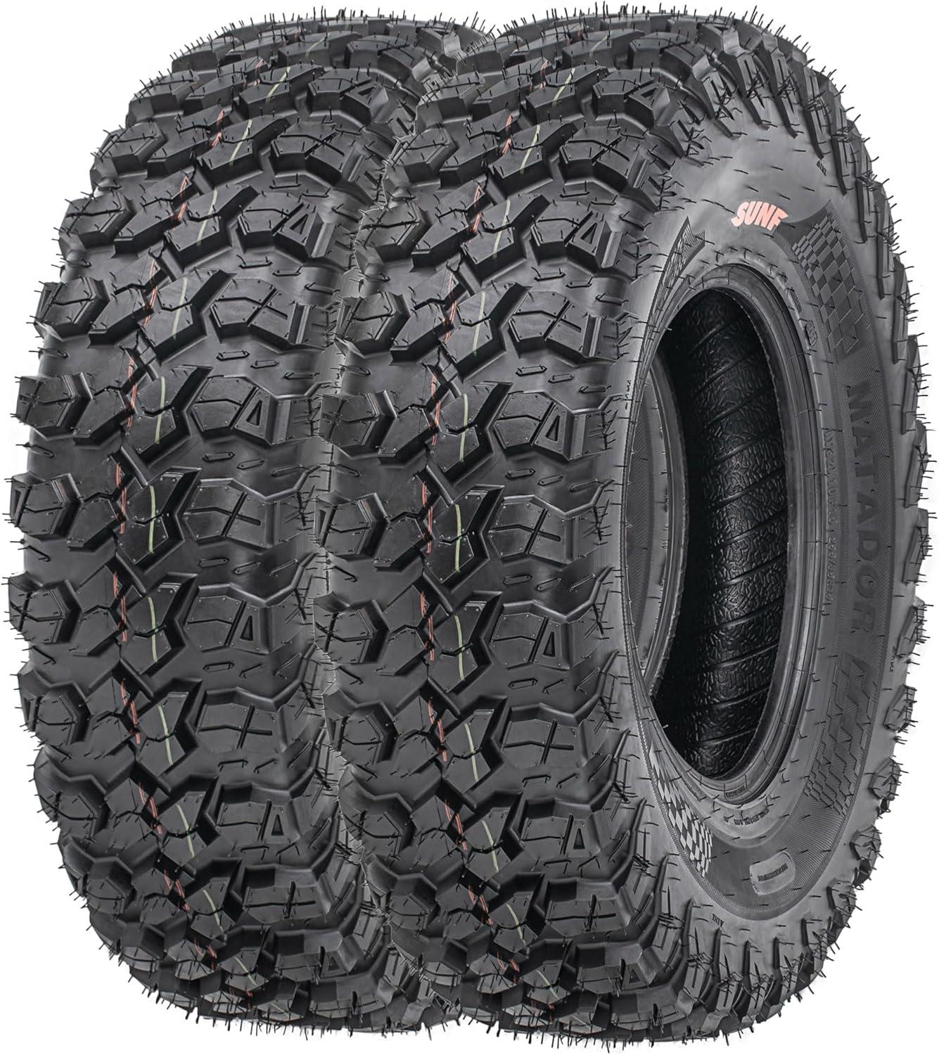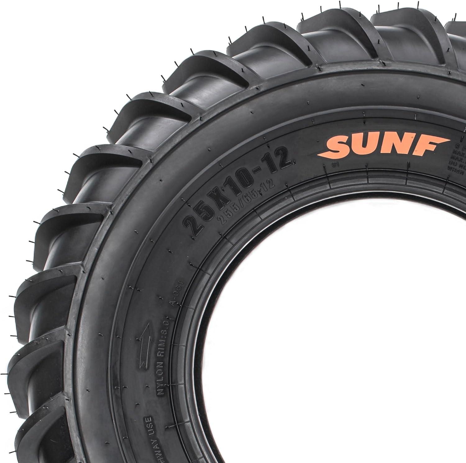 SunF Corporation has dedicated themselves to meeting their customer’s demands and needs. SunF develops and manufactures a wide variety of quality tires in the specialty market. Their line up includes ST trailer, lawn and garden, agriculture, golf cart, ATV Quad Motorcycle, UTV Side by Side, light truck & more!The SUNF A061 tire features a specialized directional paddle-style tread pattern designed for aggressive all-terrain performance in recreational riding or racing.Exceptional Traction: With its paddle-style design, this tire delivers outstanding traction in sand, mud, and other challenging terrains, making it ideal for riders seeking maximum grip.Durable 6-Ply Construction: Built with a robust 6-ply construction, the A061 tire is constructed to be tough and durable, able to withstand the rigors of aggressive riding and racing.Versatile Use: Whether you're hitting the dunes, navigating muddy trails, or racing off-road, the A061 tire is engineered to excel in a variety of terrains and applications.Expanding Size Range: While currently available in 25 inches, SUNF plans to introduce more sizes in the future, ensuring that this tire can accommodate a wide range of ATV, UTV, and SxS models for various recreational and racing setups.Size 1: 25×8-12 | Size 2: 25×10-12